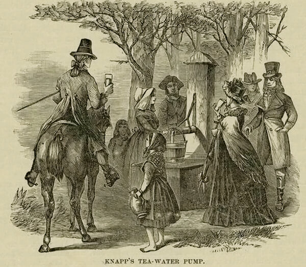 Shortly before the Revolution, the Tea Water Spring and its vicinity were made into a fashionable resort. A high pump with a prodigiously long handle was erected over the spring, and the grounds around it were laid out in ornamental fashion. The popular retreat became known as Tea Water Pump Garden.