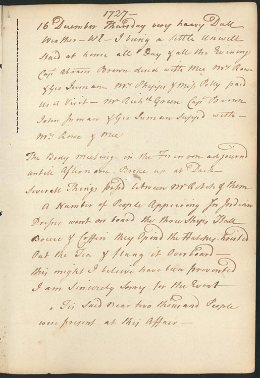 The meeting was tense and spirited language filled the air as thousands waited hours for Rotch to return with the response from the Lieutenant Governor and Chief Justice of Massachusetts. John Rowe, the owner of the Eleanor, was reputed to have been at the meeting. Rowe was known for his smuggling and staunch anti-British policy leanings and was so angered with the situation that he is recorded to have said, “Perhaps salt water and tea will mix tonight!” Rowe is remembered as one of the inciters of the Boston Tea Party, yet he attempted to cover up his participation in the planning by recording false entries in his diary as to his whereabouts on December 16. After several hours and at approximately 6:00 in the evening, Francis Rotch finally returned to the Old South Meeting House with the response from Hutchinson.